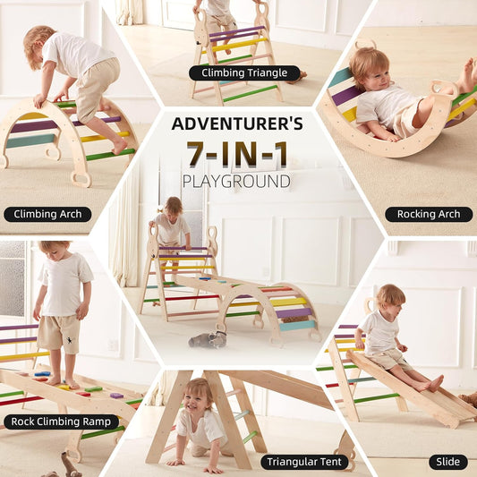 LVHERO 7 in 1 Pikler Triangle Set, Foldable Toddler Baby Climbing Toys, Wooden Montessori Climbing Set, Baby Climber Indoor Playground Jungle Gym for Toddlers Montessori Toys-Rainbow