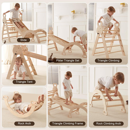 LVHERO 7 in 1 Pikler Triangle Set, Foldable Toddler Baby Climbing Toys, Wooden Montessori Climbing Set, Baby Climber Indoor Playground Jungle Gym for Toddlers Montessori Toys -Nature Wood